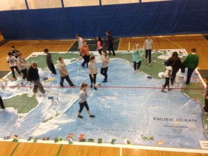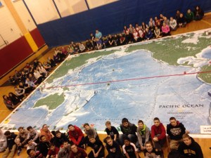 “The kids really enjoyed walking on the map and were very interested in learning about the Pacific Ocean,” said WMS Grade 7 Social Studies Teacher Dana Robinson, who organized the event. “This opportunity was made possible through a grant from SEMAGNET (Southeast Massachusetts Geography Network) and Bridgewater State University. Professor Vernon Domingo oversaw the scheduling of the map expositions. University representatives delivered and picked up the map.”