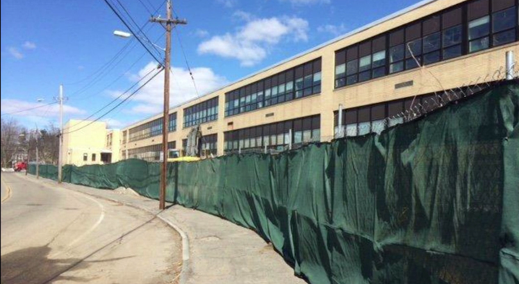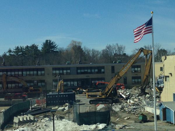 Yesterday, the high school’s cafeteria was the first portion of the building to be torn down since the gym was demolished back in February 2013. See some video of Wednesday’s demolition HERE. Demolition photos tweeted yesterday by Assistant Principal Dennis Mahoney and teacher Amanda Donahue can be found at the bottom of this article.