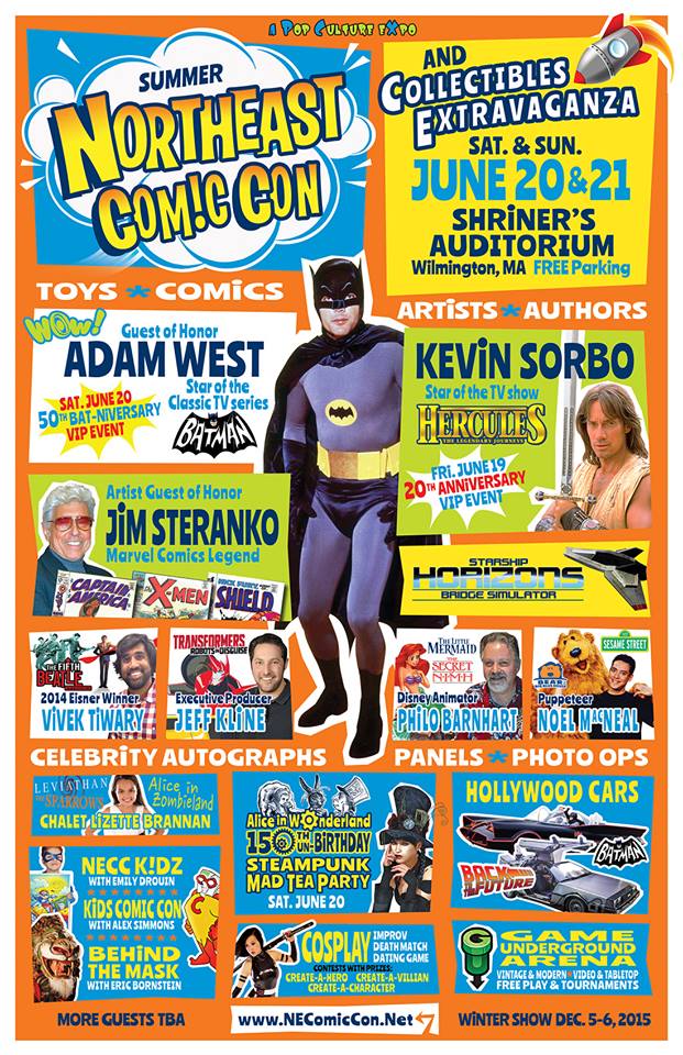 WILMINGTON, MA — Fans of Adam West (Batman, Family Guy) and Kevin Sorbo (Hercules, Andromeda) are invited share a VIP experience with two legendary superstars celebrating anniversaries of their first TV episodes. Both fan experiences are just one element of the largest celebration of popular culture in New England, the Northeast Comic Con and Collectibles Extravaganza. This Father’s Day weekend event takes place Saturday June 20 and Sunday June 21, 2015 at the Shriners Auditorium in Wilmington, Mass. (99 Fordham Road). General show hours are 10 a.m. – 6 p.m. on Saturday and 10 a.m. to 5 p.m. Sunday; VIP experiences are at 7 p.m. on both Friday and Saturday night, June 19th and 20th.