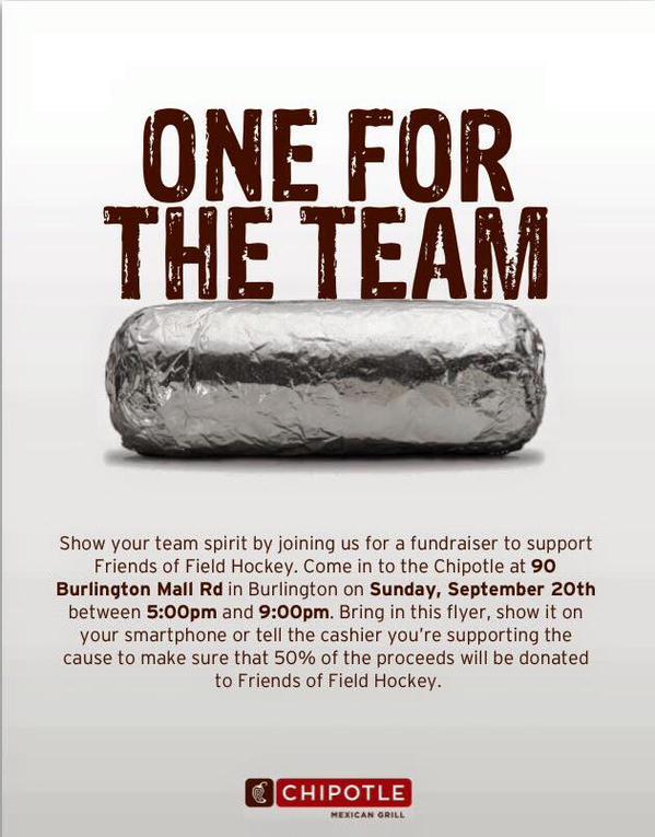 WILMINGTON, MA — The Friends of Wilmington High School Field Hockey has organized a fundraiser at the Chipotle in Burlington (90 Burlington Mall Road) on Sunday, September 20, 5pm-9pm. 50% of each sale will be donated to the organization. Just bring the flyer below, show it on your smart phone, or tell the cashier you’re supporting the group.