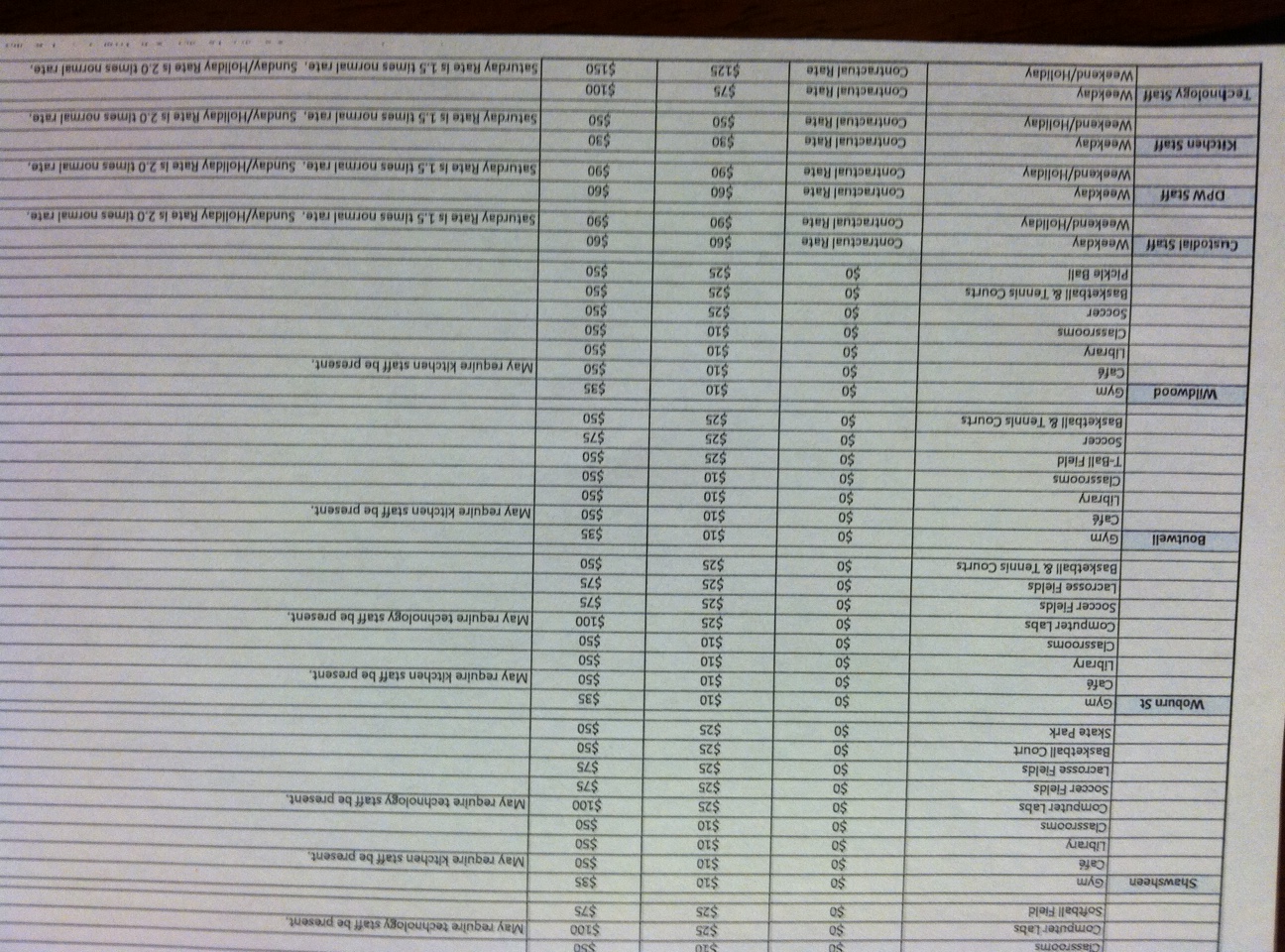 There are different rates for (1) in-town non-profit groups (including Youth Groups); (2) in-town for-profit and out of town non-profit groups; and and (3) out-of-town for-profit groups. In-town non-profit groups, as noted above, aren’t charged anything for renting the facility space itself, but are charged to pay for any necessary custodial staff, DPW staff, kitchen staff, or technology staff.