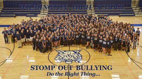 The official Twitter account of Wilmington Public Schools recently tweeted out the photo below, taken on Monday, with the caption: “Thanks to all, especially these WHS student athletes, for making Blue Shirt Day a success! #StompOutBullying”