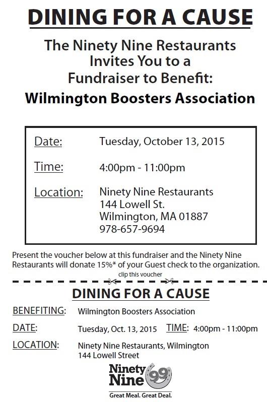 WILMINGTON, MA — The Wilmington Boosters Association is holding a “Dining For A Cause” fundraiser at the Ninety Nine Restaurant (144 Lowell Street) on Tuesday, October 13, 4pm-11pm.