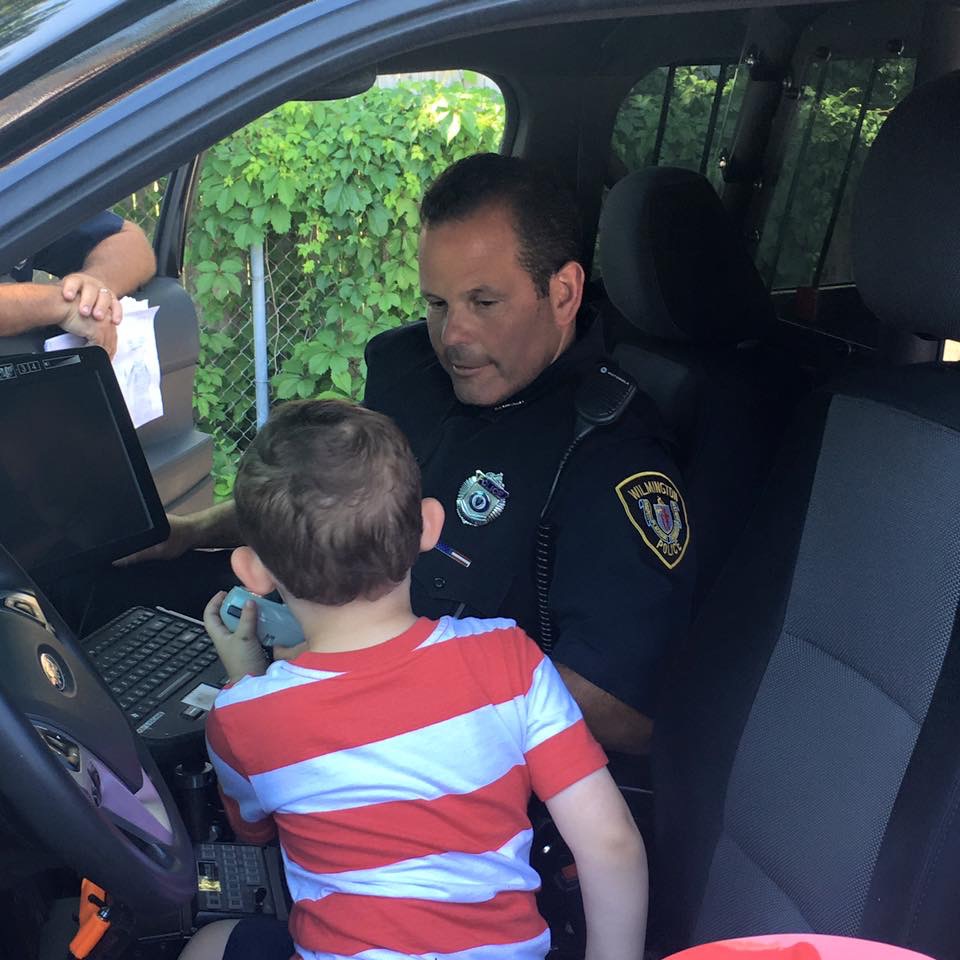 July 12, 2016 PHOTOS: Wilmington Police & Fire Visit Tiny Tots & Kids Club 960 × 960 IMG_1960 Jack Solimini walking with one of the Wilmington Police Department officers about the police car.
