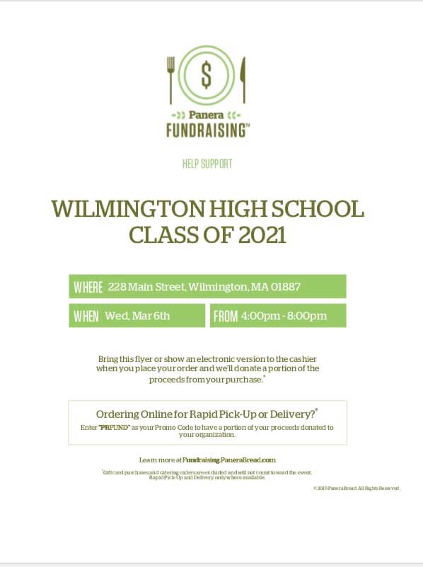 Wilmington High School Class of 2021 is holding a Fundraiser at Wilmington’s Panera Bread (228 Main Street, Wilmington Plaza) from 4pm to 8pm. Bring this flyer or show it on your phone to the cashier when you place your order. Panera Gift Cards and catering orders are excluded from the event.