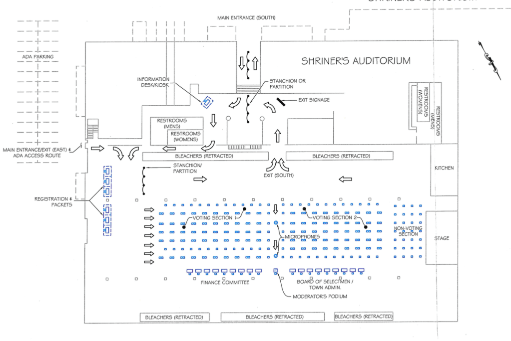 “The auditorium provides more than enough space to accommodate expected turnout which was 296 registered voters and 14 non-residents in 2020,” explained Hull. “Adequate space will be available for registration, for WCTV’s set-up, and to provide seating for non-residents. The size of the Shriners Auditorium would allow for a similar set-up to the 2020 Annual Town Meeting with the appropriate social distancing. Keeping the bay doors open would provide adequate air circulation while removing the issue of weather as a factor for participants. The Shriners Auditorium is accessible to all, has adequate parking, and provides the necessary space and restroom facilities.”