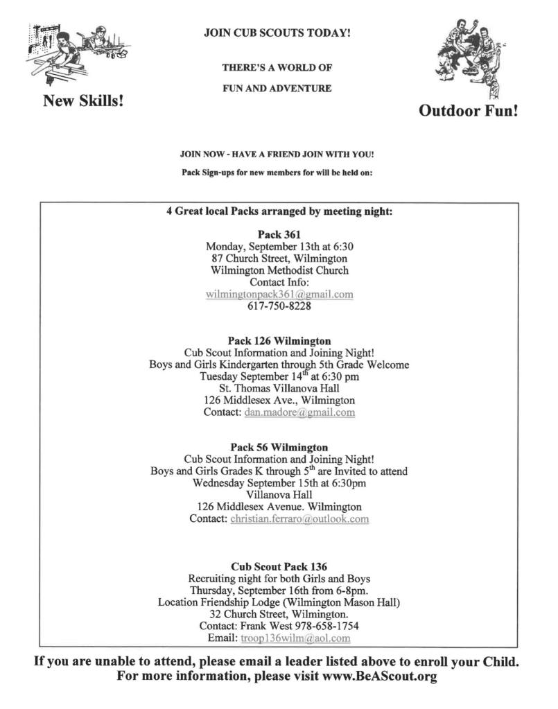 WILMINGTON, MA — The four Cub Scout Packs in Wilmington are holding membership recruitment Open Houses this coming week. Below is information on each Open House and how to get in touch with each troop.