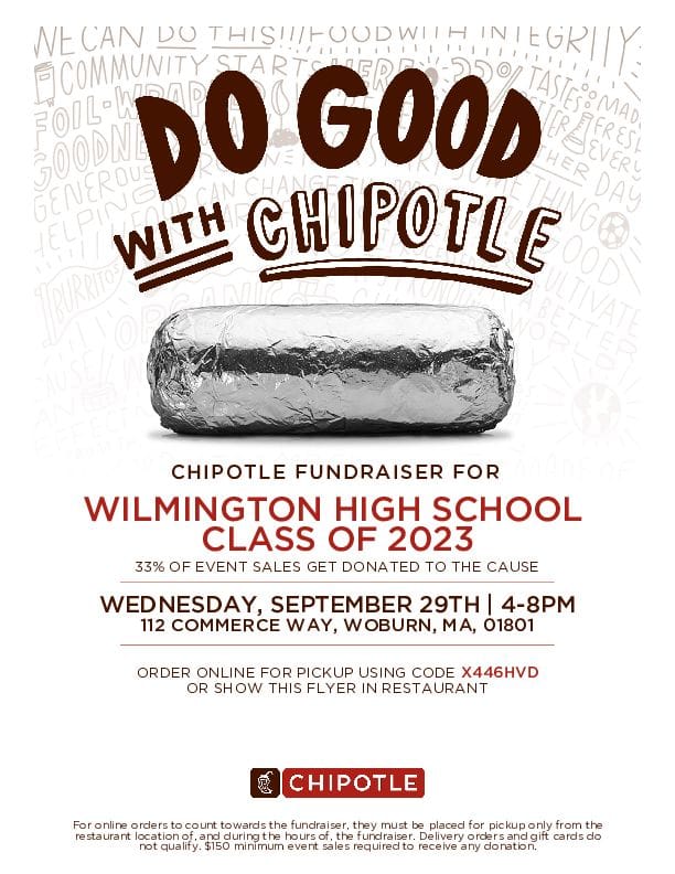 - The Wilmington High School Class of 2023 is holding a fundraiser at Chipotle in Woburn (112 Commerce Way) from 4pm to 8pm. Order in person using this flyer or online using the code X446HVD.
