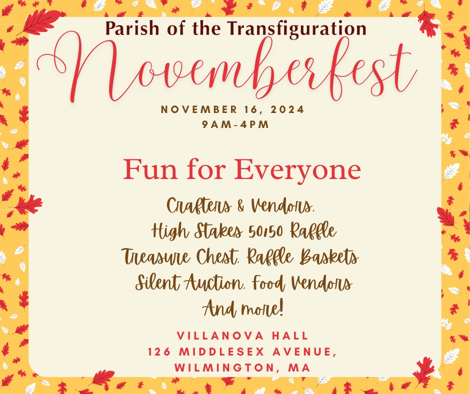 WILMINGTON, MA — Wilmington residents are invited to the Parish of the Transfiguration’s First Novemberfest on Saturday, November 16, 2024, from 9am to 4pm, in Villanova Hall (126 Middlesex Avenue).
