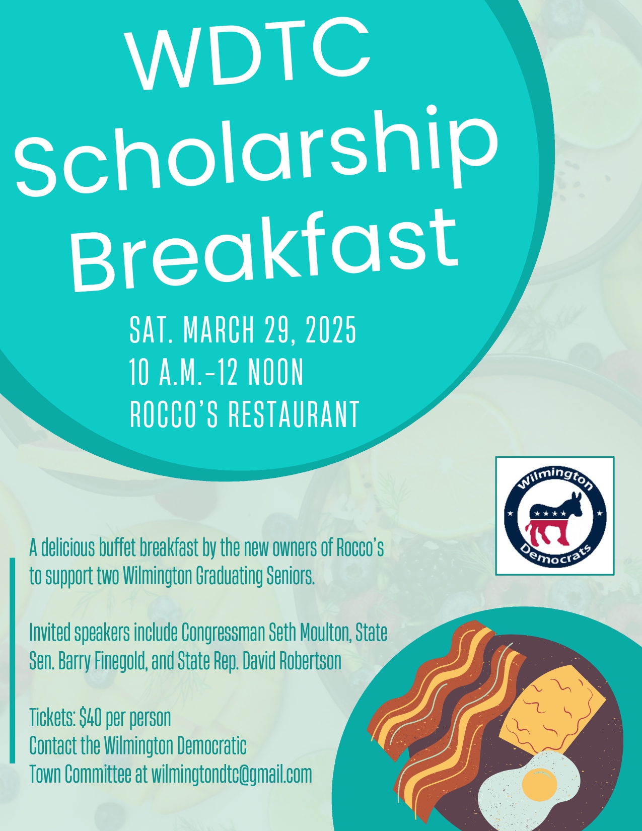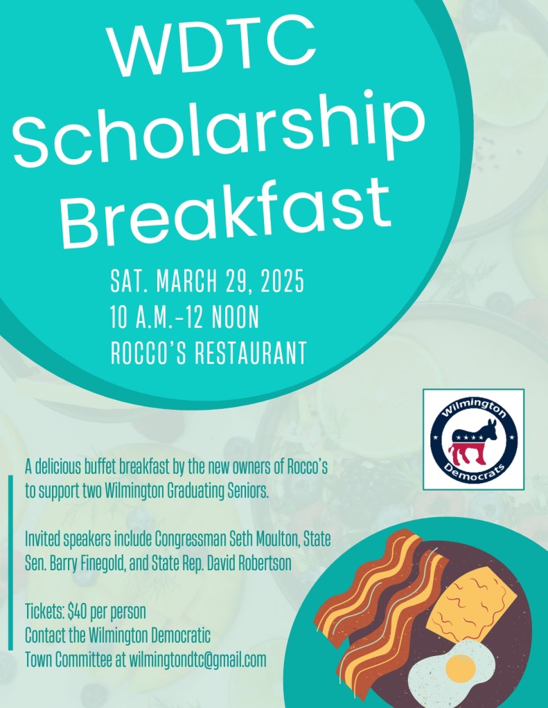 WILMINGTON, MA — The Wilmington Democratic Town Committee will host its Annual Scholarship Breakfast on Saturday, March 29, 2025, from 10am to noon, at Rocco’s Restaurant & Bar (193 Main Street).