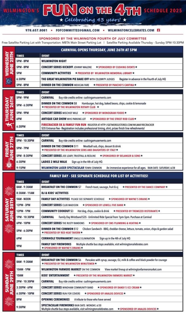 WILMINGTON, MA — The Wilmington Fourth of July Committee has just released the schedule for the 2025 Wilmington Fun on the Fourth celebration.