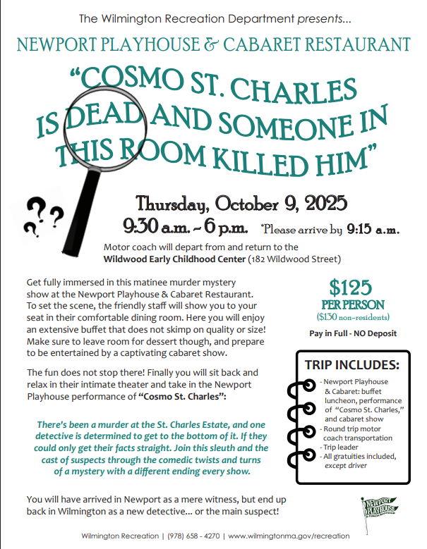 WILMINGTON, MA — The Wilmington Recreation Department is offering a day trip to the Newport Playhouse and the Cabaret Restaurant on Thursday, October 9, 2025, from 9:30am to 6pm. Attendees will enjoy a murder mystery show — “Cosmo St. Charles Is Dead And Someone In This Room Killed Him.” Learn more HERE.