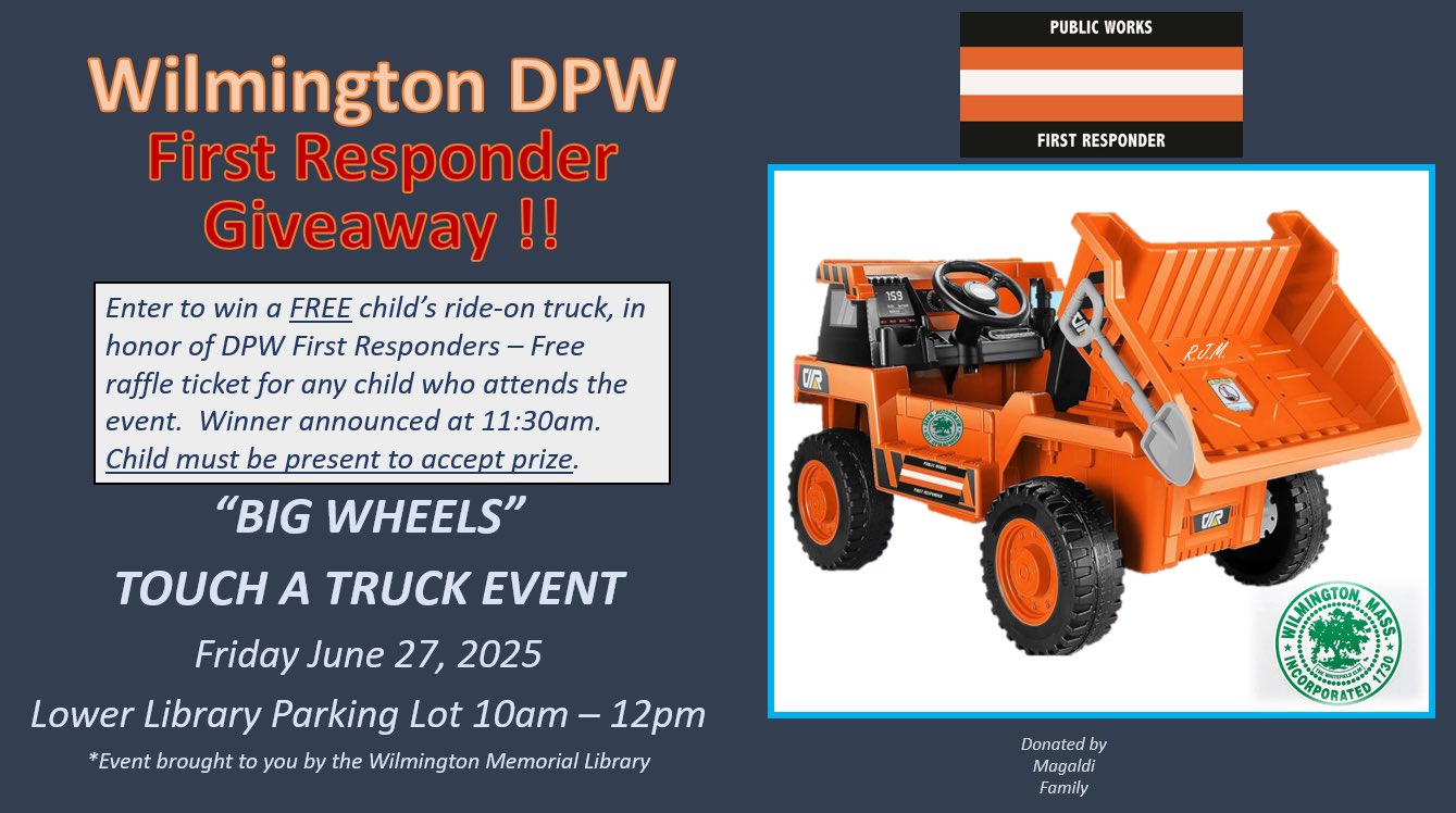 WILMINGTON, MA — Wilmington Memorial Library’s annual Big Wheels event is Friday, June 27, 2025, from 10am to noon, in the Lower Library Parking Lot. Check out fire engines, construction vehicles, police cars and more! Climb inside and ask their operators questions.