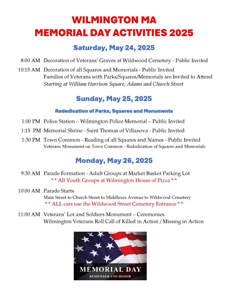 WILMINGTON, MA — Residents are invited to participate in Memorial Day observances commencing on Saturday, May 24, 2025 beginning at 8am with the decoration of veterans’ graves at Wildwood Cemetery followed by the decoration of all squares and memorials.