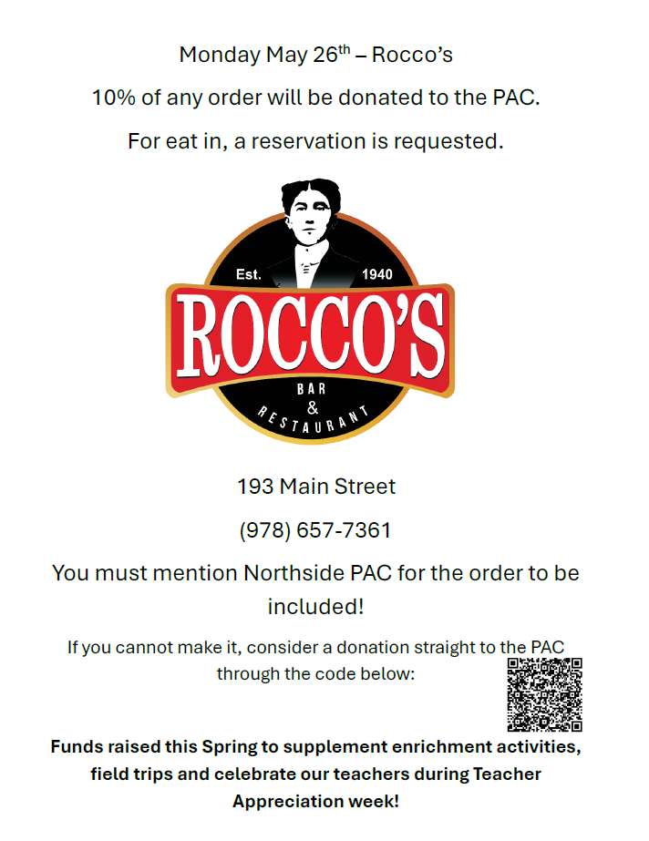 WOBURN, MA — The Northside PAC has organized a fundraiser at Rocco’s Restaurant & Bar (193 Main Street) on Monday, May 26, 2025. 10% of each sale will be donated to the PACs for the North Intermediate School and Woburn Street School. Just bring the flyer below or show it on your phone. If you plan on dining in, you must make a reservation.