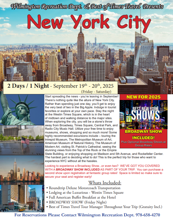 WILMINGTON, MA — Have you ever gone on our day trips to the Big Apple and wished you could spend more time there? Well, start spreading the news – you’re leaving in September for a 2 day trip!