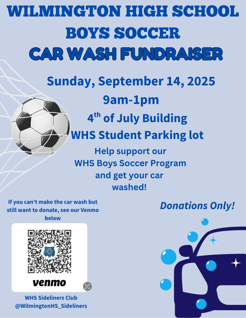 WILMINGTON, MA — The Wilmington High School Boys Soccer teams are holding a Car Wash Fundraiser this Sunday, September 14, 2025, from 9am to 1pm, in the Wilmington High School parking lot. Donations will be accepted via cash or Venmo (@WilmingtonHS_Sideliners).