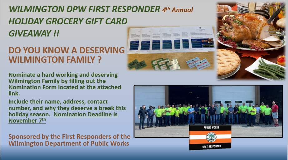 Nominate them using THIS FORM to receive a FREE holiday grocery gift card, sponsored by the First Responders of the Wilmington Department of Public Works.