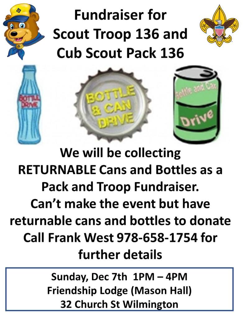 WILMINGTON, MA — Residents are encouraged to drop off empty returnable bottles and cans to Troop 136 and Cub Scout Pack 136 this Sunday, December 7, 2025, from 1pm to 4pm, at the Friendship Lodge/Masonic Hall (32 Church Street).