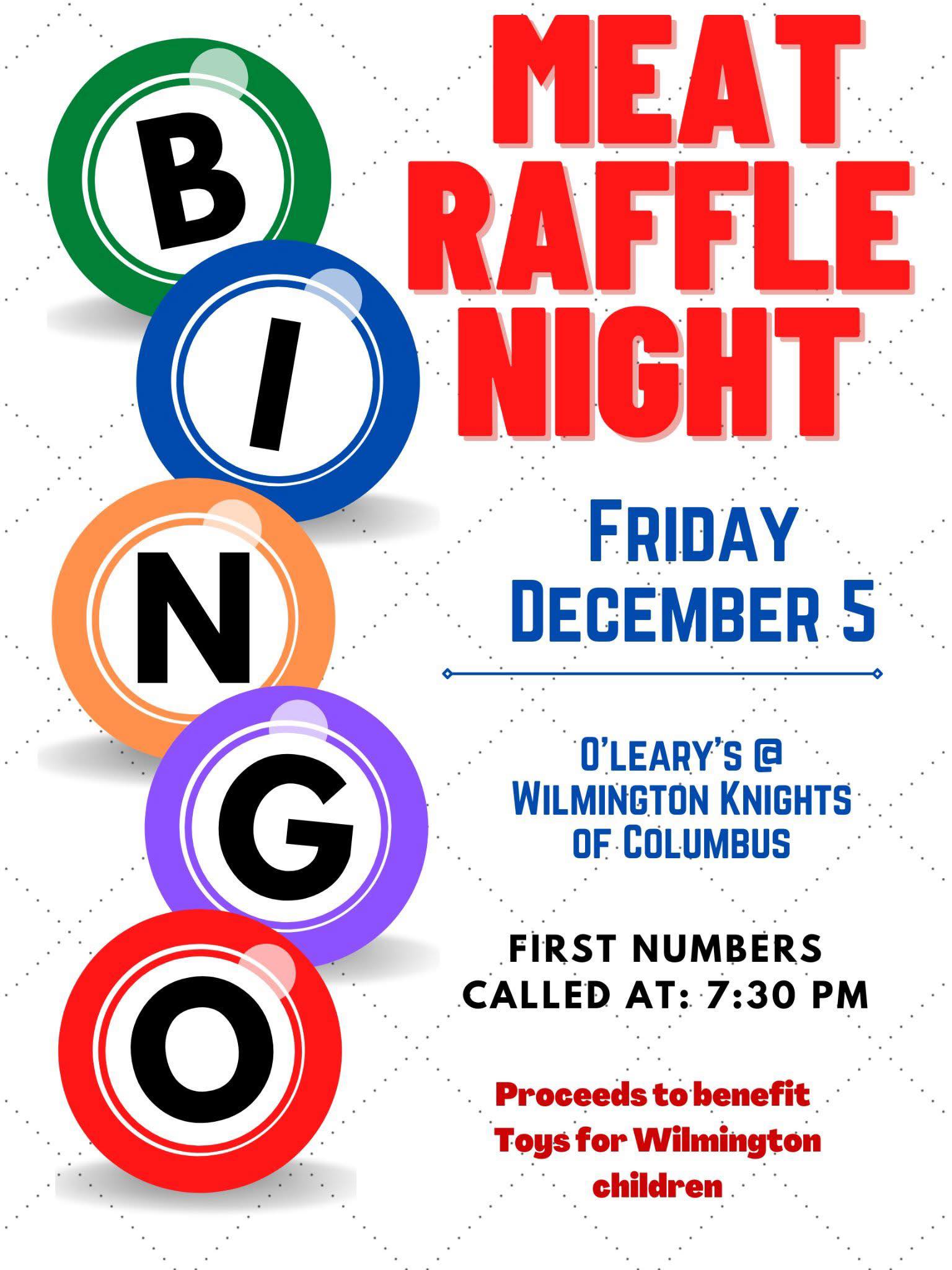 WILMINGTON, MA — The Wilmington Knights of Columbus is holding a Meat Raffle Bingo Night this Friday, December 5, 2025 at the KofC Hall’s O’Leary Pub (112 Middlesex Avenue). Bingo will begin at 7:30pm sharp. Bingo supplies provided. Must be 21 and over. Proceeds from the fundraiser will benefit the Toys for Wilmington Children program.