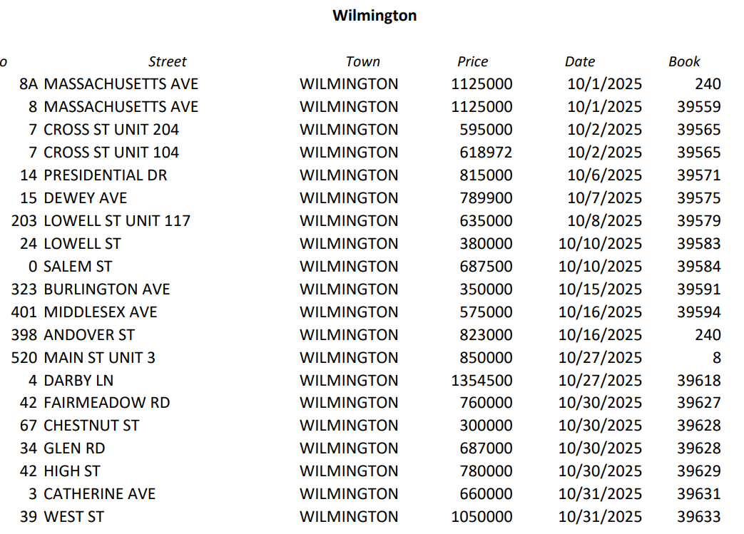 WILMINGTON, MA — According to the Middlesex North Registry of Deeds, 20 properties were sold in Wilmington during October 2025: