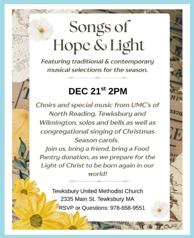 TEWKSBURY, MA — The Wilmington United Methodist Church presents “Songs Of Hope & Light” on Sunday, December 21, 2025 at 2pm at the Tewksbury United Methodist Church (2335 Main Street, Tewksbury).