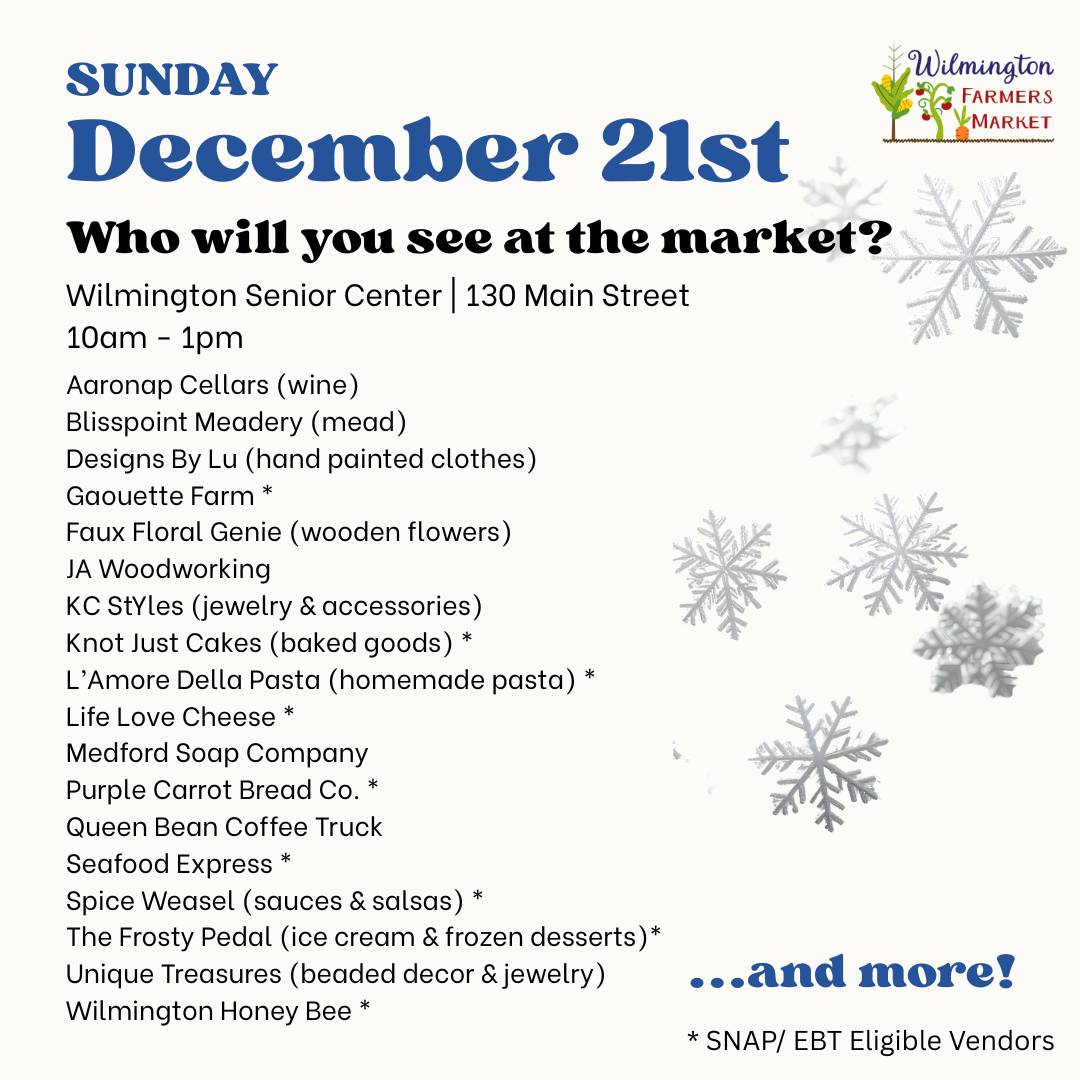 WILMINGTON, MA — The Wilmington Farmers Market will be open this Sunday, December 21, 2025, from 10am to 1pm, at the Wilmington Senior Center (130 Main Street).