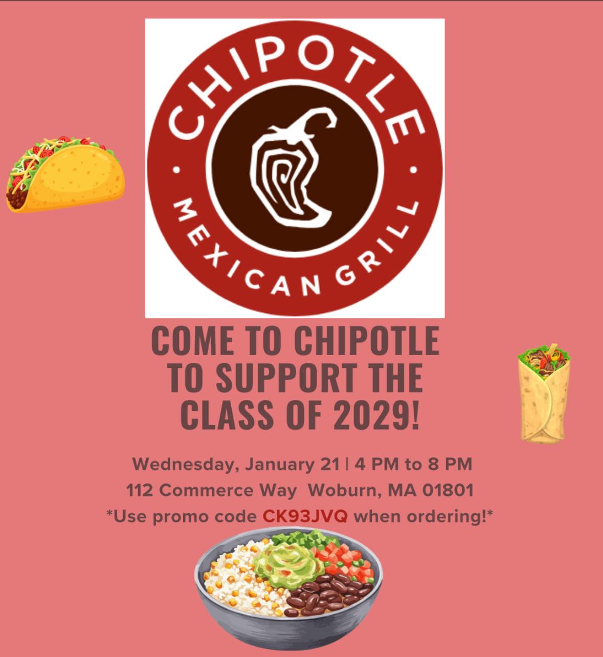 WOBURN, MA — The Wilmington High School Class of 2029 has organized a fundraiser at the Chipotle in Woburn (112 Commerce Way) on Wednesday, January 21, from 4pm to 8pm. 25% of each sale will be donated to the WHS freshmen class. Just bring the flyer below or show it on your phone. Use the code CK93JVQ when ordering online.