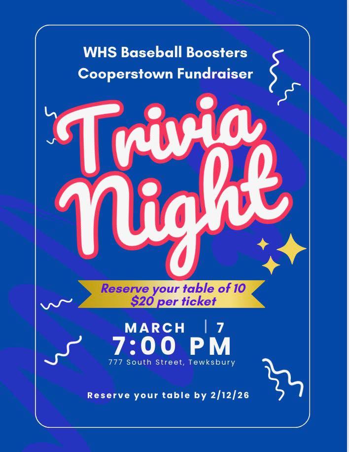 WILMINGTON, MA — The WHS Baseball Boosters is holding a Trivia Night fundraiser on Saturday, March 7, 2026 at 7pm at the Tewksbury-Wilmington Elks (777 South Street, Tewksbury). Tickets cost $20. Tables of 10 are available. Reserve you ticket(s) by Thursday, February 12, 2026 by texting 617-877-0952. The funds raised will support the WHS Varsity Baseball playing at Cooperstown in April.