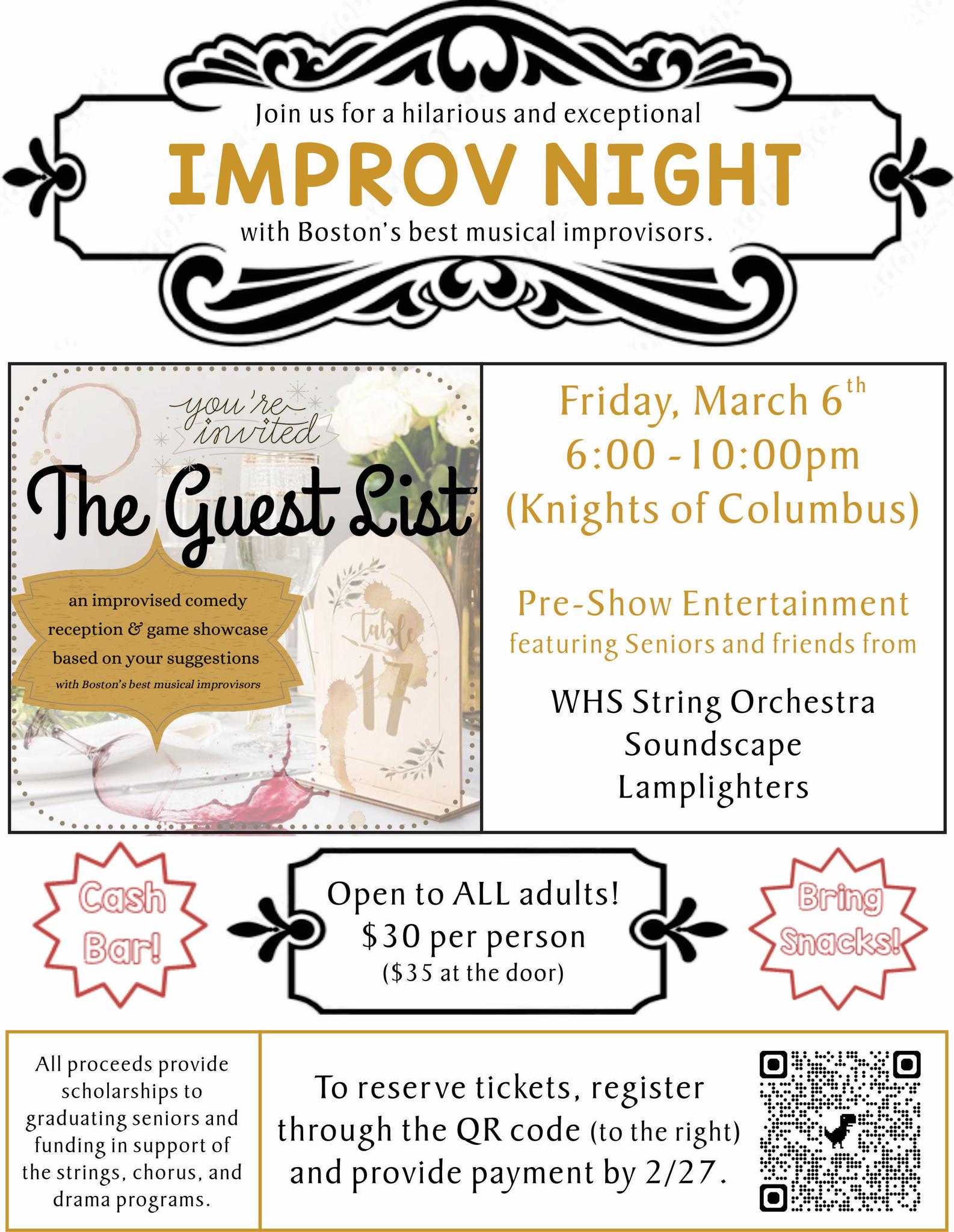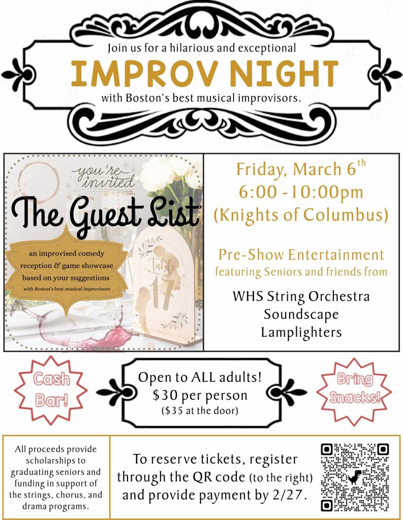 Pre-show entertainment will feature seniors and friends from the WHS Strings Orchestra, Soundscape and Lamplighters. Cash bar. Bring snacks.
