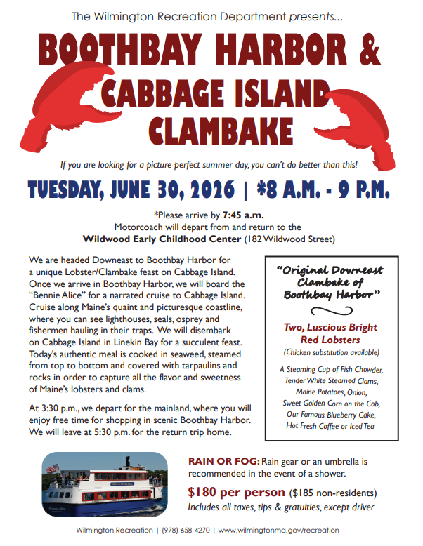 WILMINGTON, MA — The Wilmington Recreation Department is offering a day trip to Boothbay Harbor for a unique Lobster/Clambake feast on Cabbage Island on Tuesday, June 30, 2026, from 8am to 9pm. The trip costs $180 per person ($185 for non-residents). Read the flyer HERE.