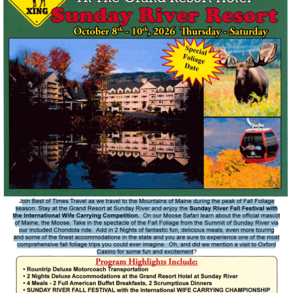 WILMINGTON, MA — The Wilmington Recreation Department is offering a 3-day trip to the mountains of Maine, with a two night stay at the Grand Resort at Sunday River from Thursday, October 8, 2026 to Saturday, October 10, 2026. The trip costs $1,170 for a single; $960 per person for a double; and $940 per person for a triple. Learn more HERE.