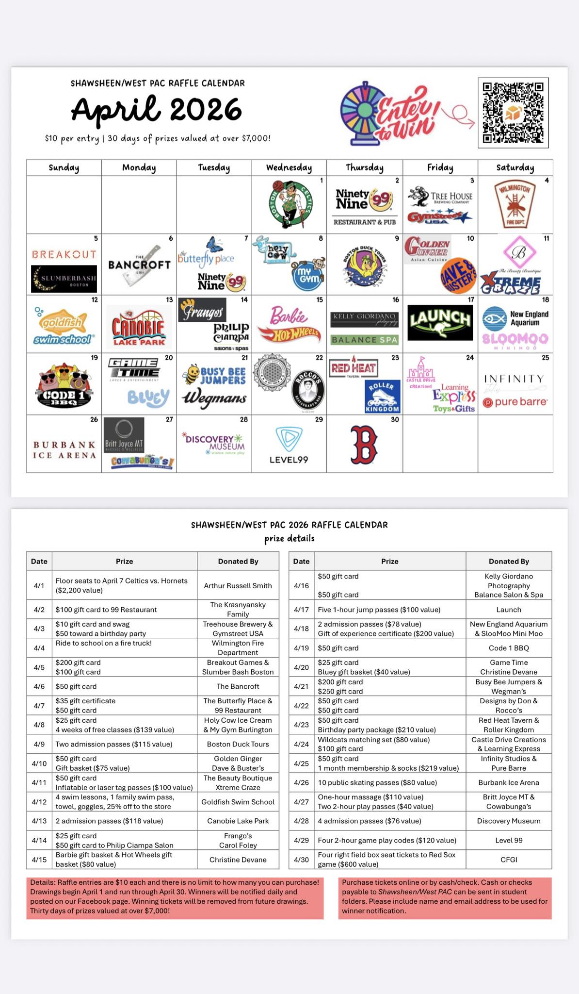 WILMINGTON, MA — The public is invited to try their luck in the Shawsheen/West Pac’s Calendar Raffle. Each ticket gives you a chance to win 30 days of prizes valued at over $7,000 during the month of April.