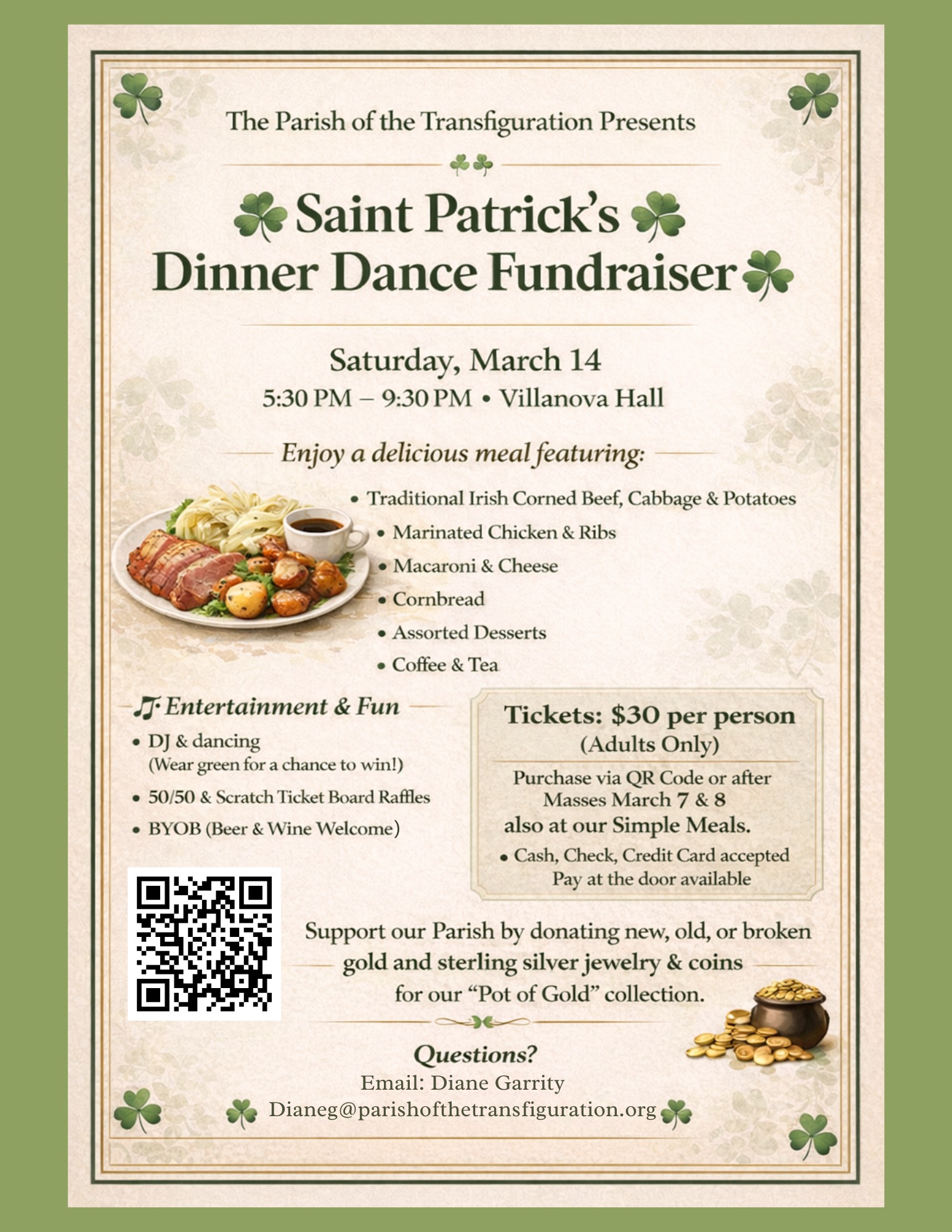 Tickets cost $30. Scan the QR code in the flyer below. Have a question? Contact Diane Garrity at Dianeg@parishofthetransfiguration.org.