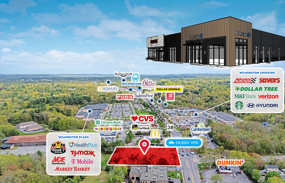 The property has frontage and visibility at the signalized intersection of Richmond St. and Main St., the area’s primary commercial and commuter corridor. Positioned in the town’s commercial district, the new construction property is adjacent to McDonald’s and the Rustica Memorial Arena and is close to Wilmington Plaza, which is anchored by Market Basket, TJ Maxx, and Ace Hardware.