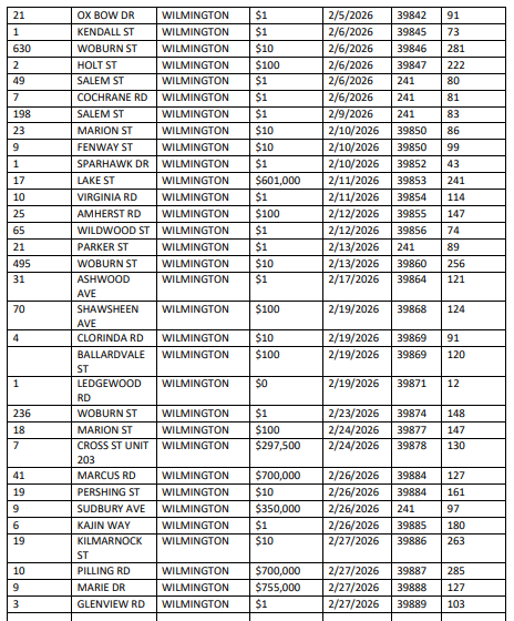 WILMINGTON, MA — According to the Middlesex North Registry of Deeds, 32 properties were sold in Wilmington during February 2026: