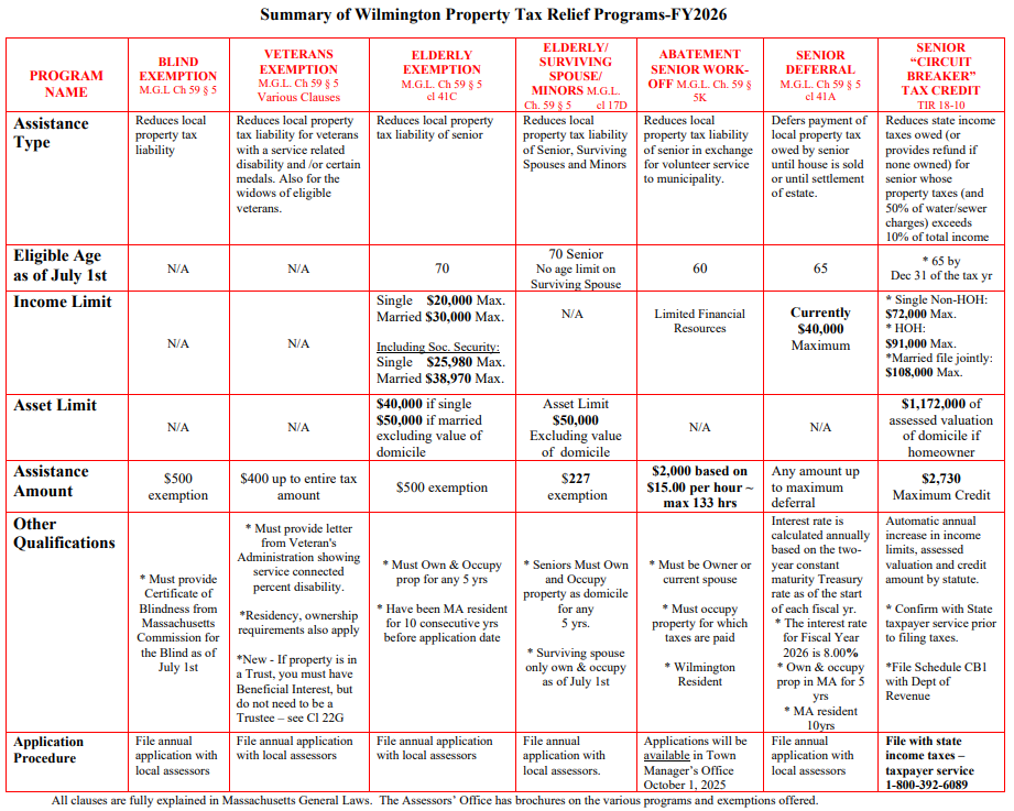 A summary of the town’s tax relief programs is below. For additional information, visit the Town Assessor’s website at www.wilmingtonma.gov/assessors-office/pages/exemptions.