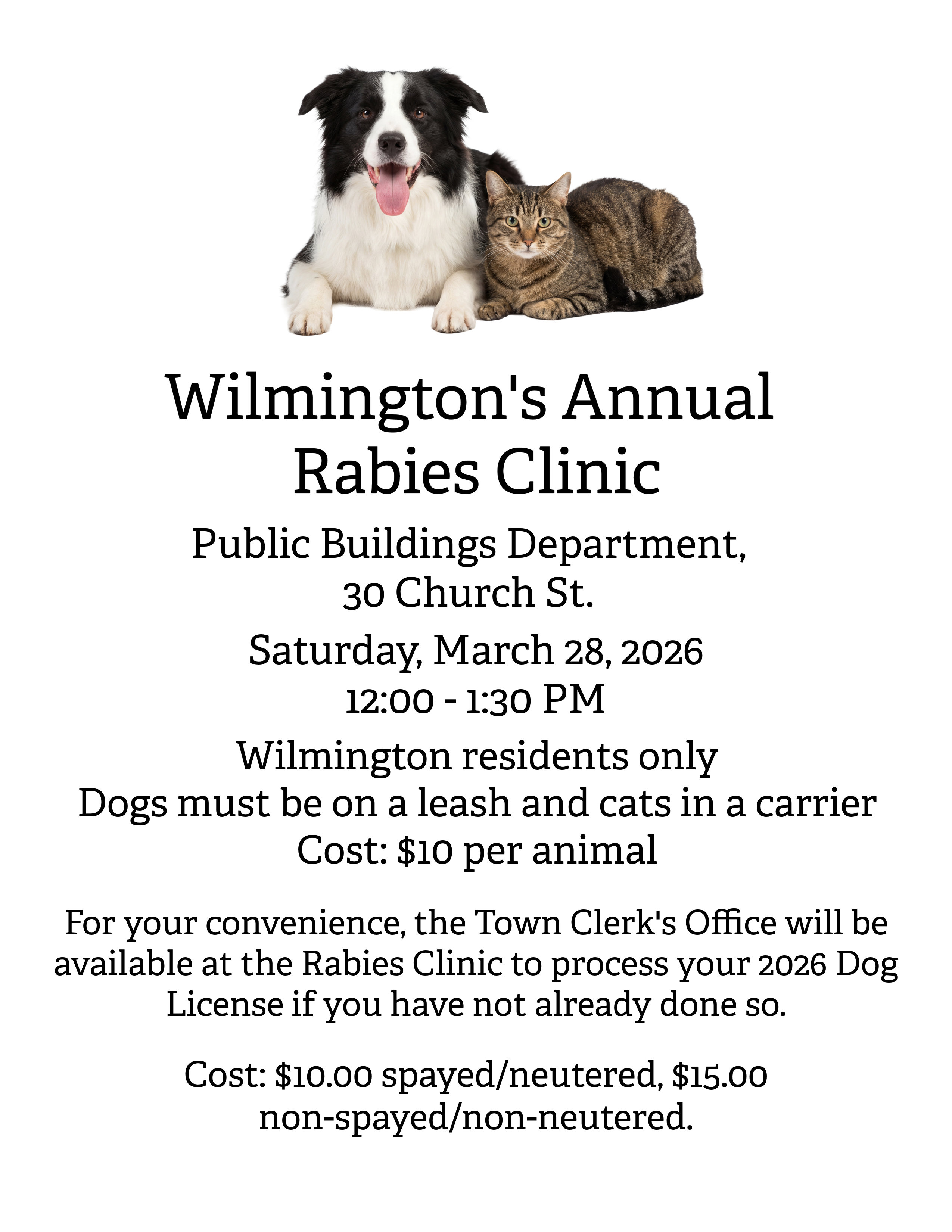 WILMINGTON, MA — The Town of Wilmington Health Department is hosting its Annual Rabies Clinic on Saturday, March 28, 2026, from noon to 1:30pm, at the Public Buildings Department (30 Church Street).