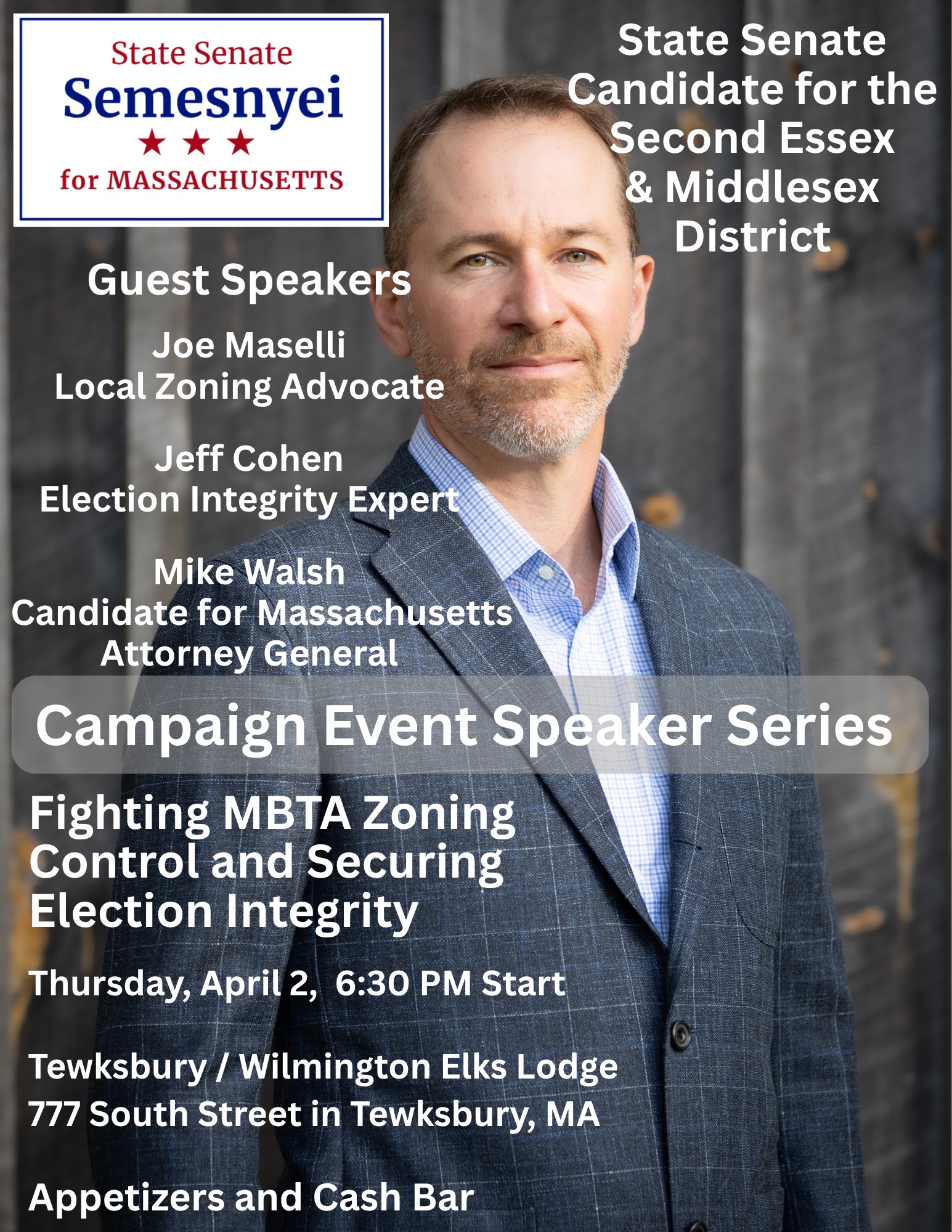 TEWKSBURY, MA — Republican State Senate candidate Ted Semesnyei will be holding a campaign event on Thursday, April 2, 2026 at 6:30pm at the Tewksbury-Wilmington Elks (777 South Street). Semesnyei is running for the 2nd Essex and Middlesex District seat currently held by Democratic State Senator Barry Finegold. The district includes both Wilmington and Tewksbury.