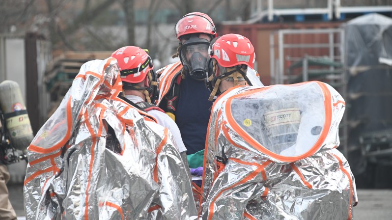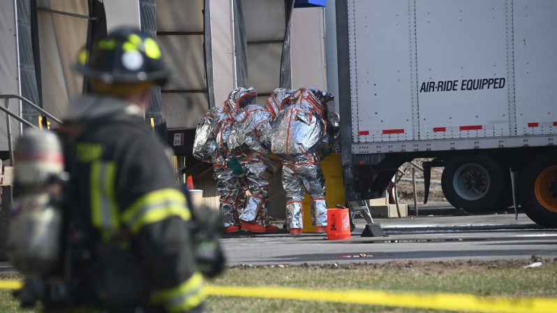 State Hazmat technicians in Level A protective suits prepare to go downrange and assess a leak involving dangerous chemicals in a parked trailer.