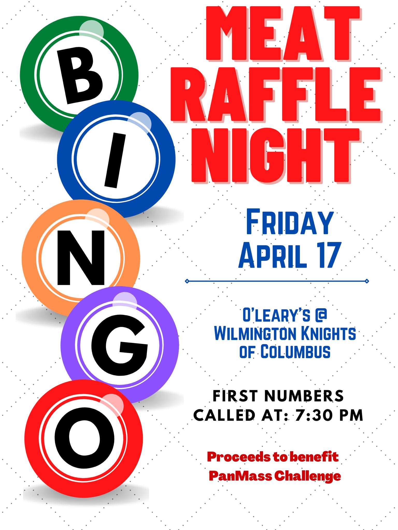 WILMINGTON, MA — The Wilmington Knights of Columbus is holding a Meat Raffle Bingo Night fundraiser on Friday, April 17, 2026 at the KofC Hall’s O’Leary Pub (112 Middlesex Avenue). Bingo will begin at 7:30pm sharp. Proceeds from the fundraiser will benefit the Pan Mass Challenge.