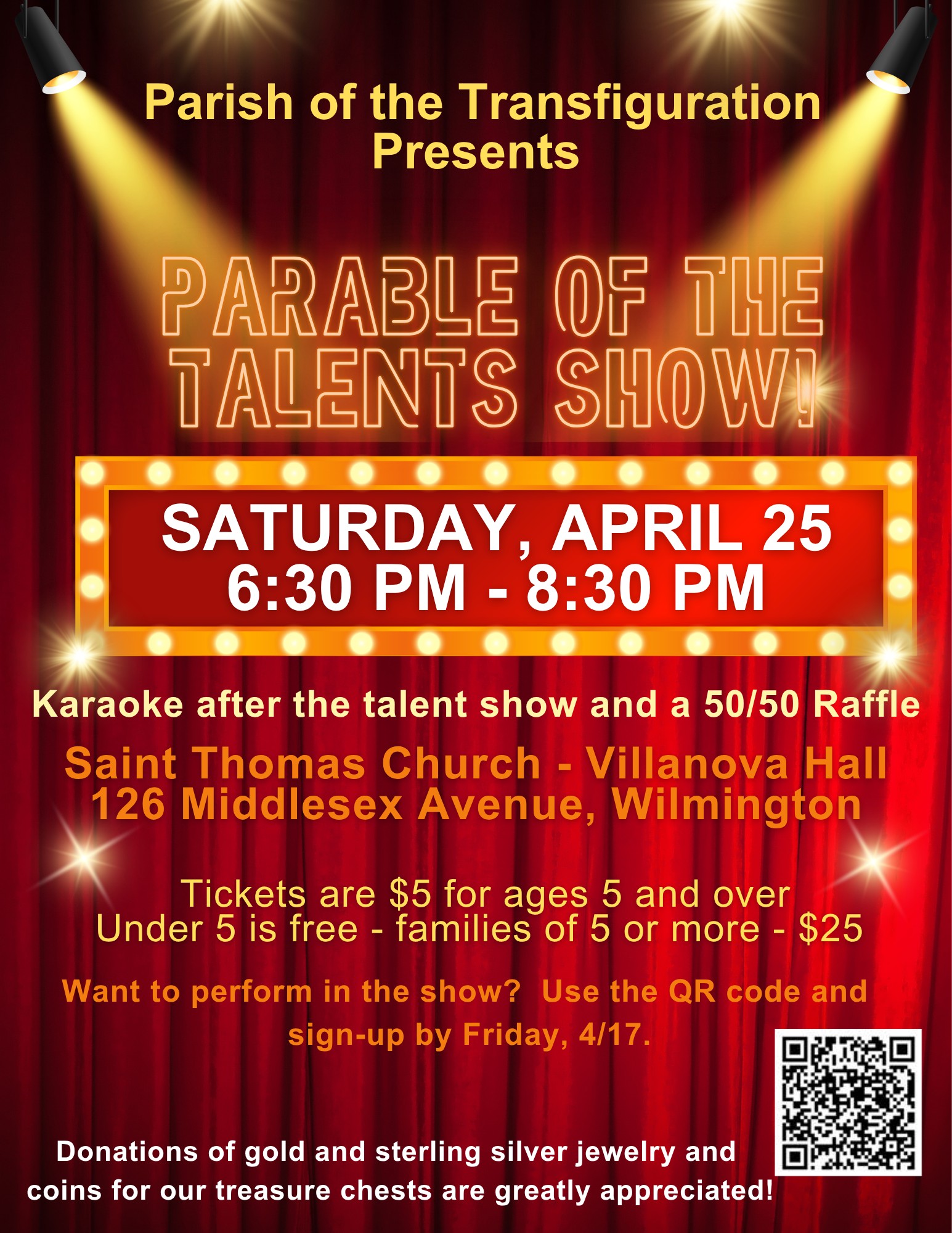 WILMINGTON, MA — The Parish of the Transfiguration presents “Parable of the Talents Show” on Saturday, April 25, 2026, from 6:30pm to 8:30pm, at Villanova Hall (126 Middlesex Avenue).