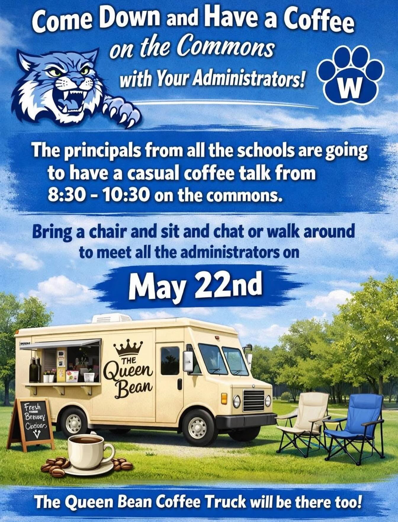 WILMINGTON, MA — Principals for each Wilmington school will be participating in “Coffee on the Commons” on Friday, May 22, 2026, from 8:30am to 10:30am. Bring a chair down to the Town Common and have casual conversations with the district’s administrators. Coffee will be available for purchase from the Queen Bean Coffee Truck.