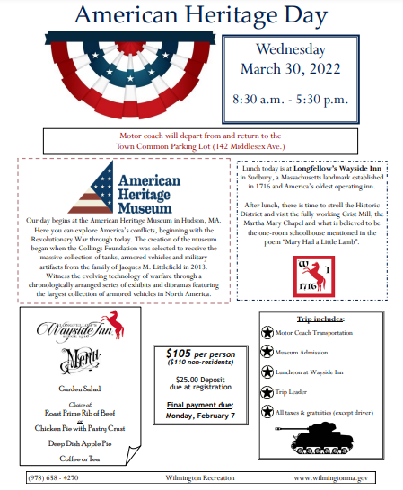 by Robert Hayes Posted on February 5, 2022February 6, 2022 Wilmington Recreation Department To Offer An American Heritage Day Trip On March 30 Read More