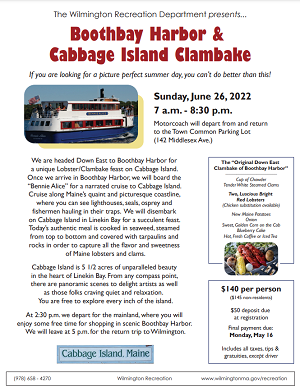 by Robert Hayes Posted on February 9, 2022February 9, 2022 Wilmington Recreation Department To Offer Day Trip To Boothbay Harbor For A Cabbage Island Clambake On June 26 Read More
