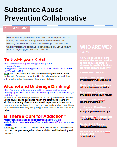 by Robert Hayes Posted on August 21, 2020August 21, 2020 Read Wilmington’s Substance Abuse Prevention Collaborative’s Latest Weekly Newsletter Read More
