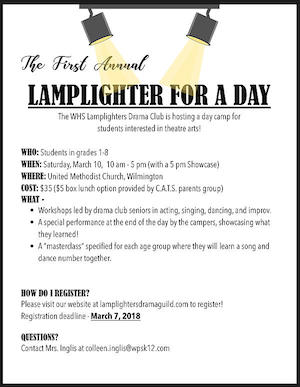by Robert Hayes Posted on February 17, 2018February 17, 2018 WHS Lamplighters Drama Club To Hold ‘Lamplighters For A Day’ Camp On March 10 Read More