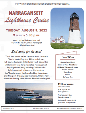 by Robert Hayes Posted on May 15, 2022May 15, 2022 Wilmington Recreation Department To Offer Narragansett Lighthouse Cruise On August 9 Read More