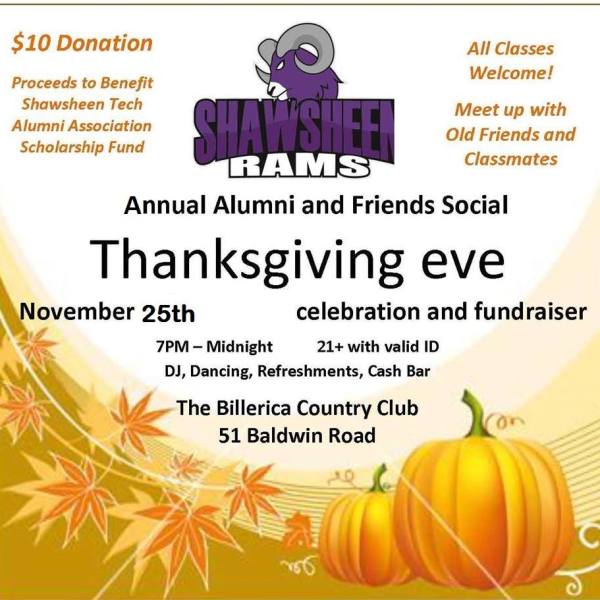 by Robert Hayes Posted on November 17, 2015November 18, 2015 WILMINGTON GIVES: Shawsheen Tech Alumni Association To Host Thanksgiving Eve Social Fundraiser Read More