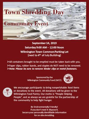 by Robert Hayes Posted on September 9, 2019September 9, 2019 THIS WEEKEND: Town Shredding Day Set For September 14, Will Benefit Wilmington Food Pantry Read More